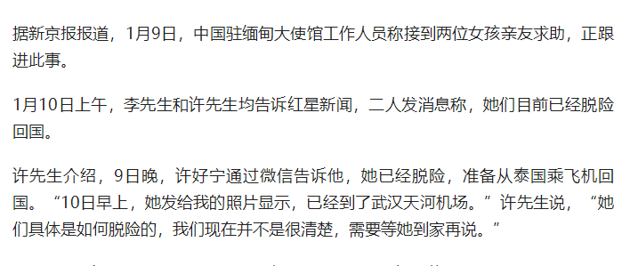 电诈园区估计也是忌惮国内施加的压力,不敢继续扣着人,所以把俩姑娘放回来了。昨天大使馆工作人员还说在跟进,今天人就回来了,速度之快确实让人意外。