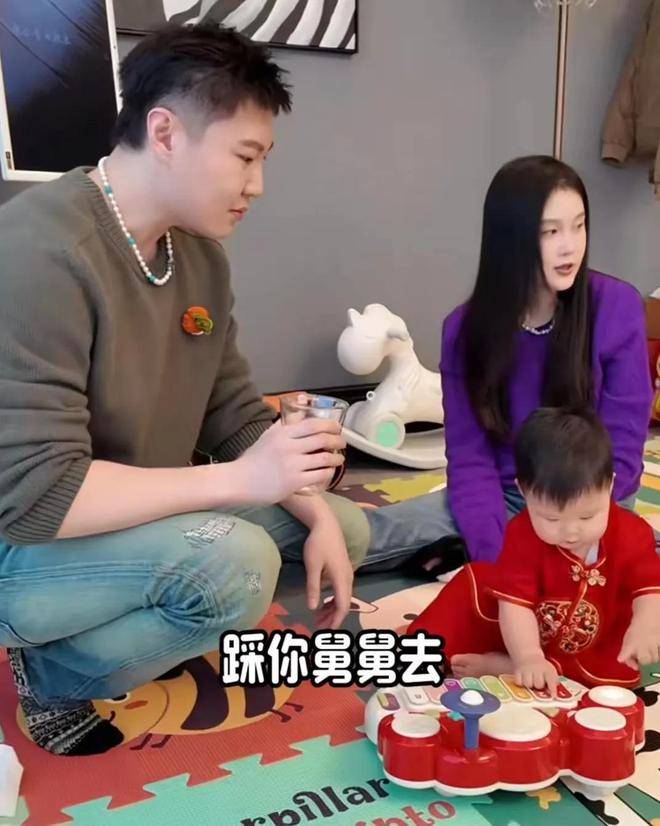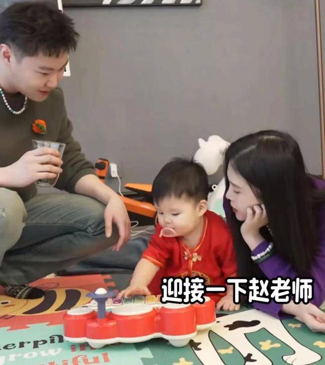 三口子在玩益智玩具,赵本山已经携夫人与孩子赵大牛来随礼了。
