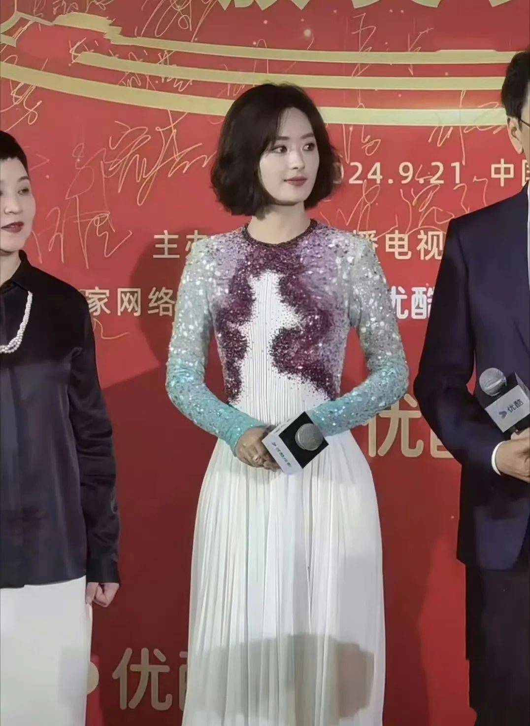 比如前几天飞天奖的红毯上,赵丽颖留着短发,穿着花裙子参加活动,礼服显得又土又廉价,发型也没选好,给人感觉像个大头娃娃。
