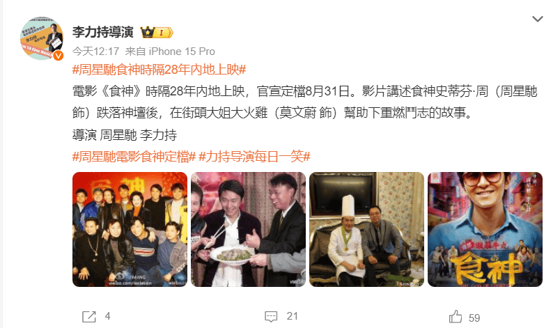 第一则是他的经典作品《食神》将在8月31日重映。这部1996年的作品,当年在香港获得了4000万港元的票房。时隔28年,如今在内地上映,很多想给星爷补票的粉丝,可以提前安排了。