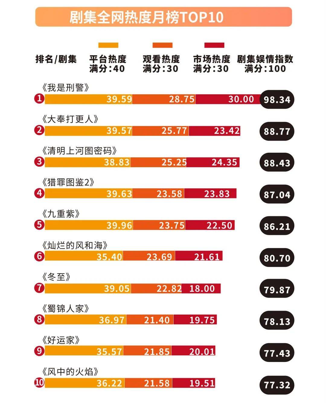《我是刑警》凭借豆瓣7.7的高口碑,以及在多个电视台的出色收视成绩,以98.34分成为本期娱情指数剧集分榜冠军,其中“观看热度”“市场热度”维度均表现优秀,得分一枝独秀。紧跟其后的是在腾讯视频等平台播放量亮眼的《大奉打更人》。《猎罪图鉴2》《九重紫》等爆款剧也顺利上榜。