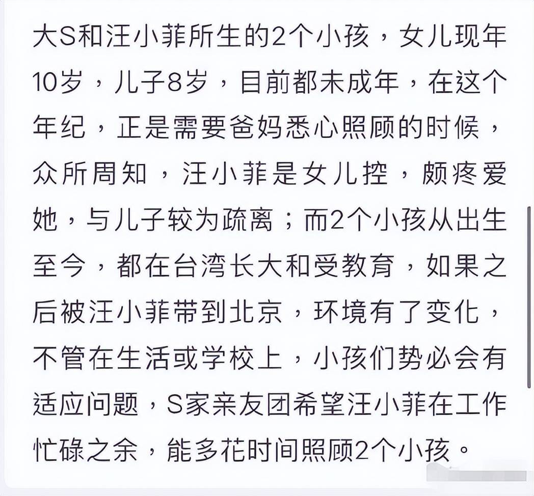 考虑到这些实际问题,S家亲属团则希望汪小菲能在工作之余,多花些时间好好陪伴两个孩子。