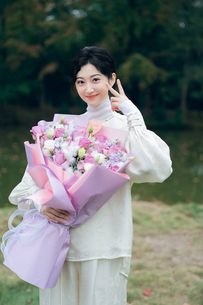 照片中的新中式造型暗藏巧思:哑光真丝面料勾勒出流畅线条,经典立领缀以简约盘扣,既保留旗袍的端庄底蕴,又以利落剪裁注入现代灵动感。她将黑发挽成低髻,额前碎发增添柔和质感,耳畔淡水珍珠耳饰与服装细节遥相呼应,手捧花束的姿态既显温婉又藏飒爽,完美诠释了 “中式松弛感”。光影透过背景枝叶洒在衣料上,形成明暗交织的层次,让传统元素在自然氛围中更显鲜活。