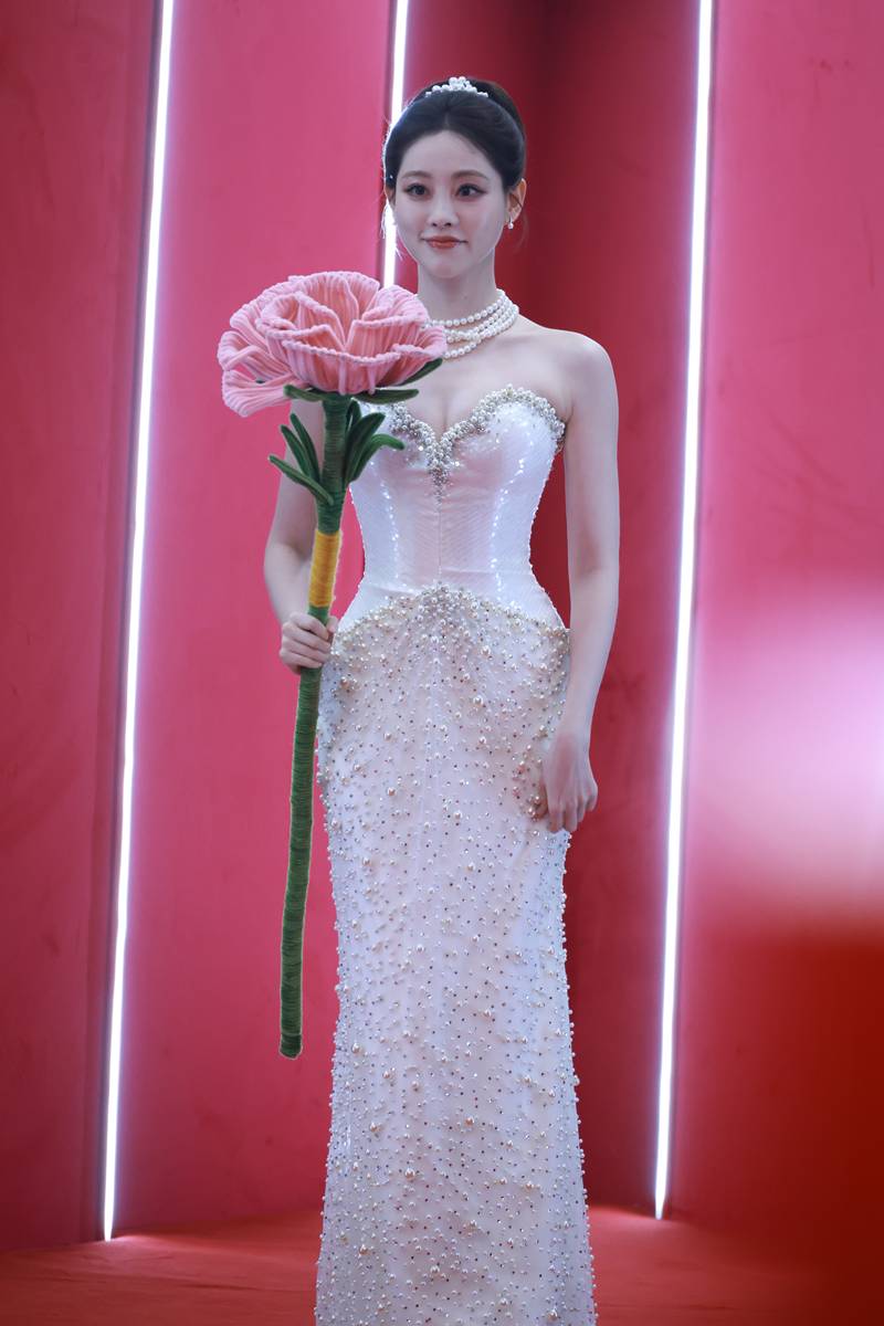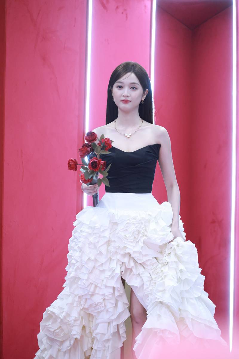 吴宣仪的登场堪称 “花仙子降临” 的名场面。她手持精致玫瑰权杖踏上红毯,黑色抹胸设计衬得肩颈线条柔美动人,下身白色褶皱大裙摆层层铺展,拖曳的裙尾在灯光下流淌着华丽质感。签名时专注的眼神与浅浅笑意交织,既有落落大方的仪态,又藏着灵动娇俏,每一步都让镜头快门声此起彼伏。紧随其后的祝绪丹以简约白裙亮相,纱质面料随动作轻扬,搭配淡雅妆容,将少女的纯净气质诠释得淋漓尽致,与吴宣仪形成 “双甜暴击”。
