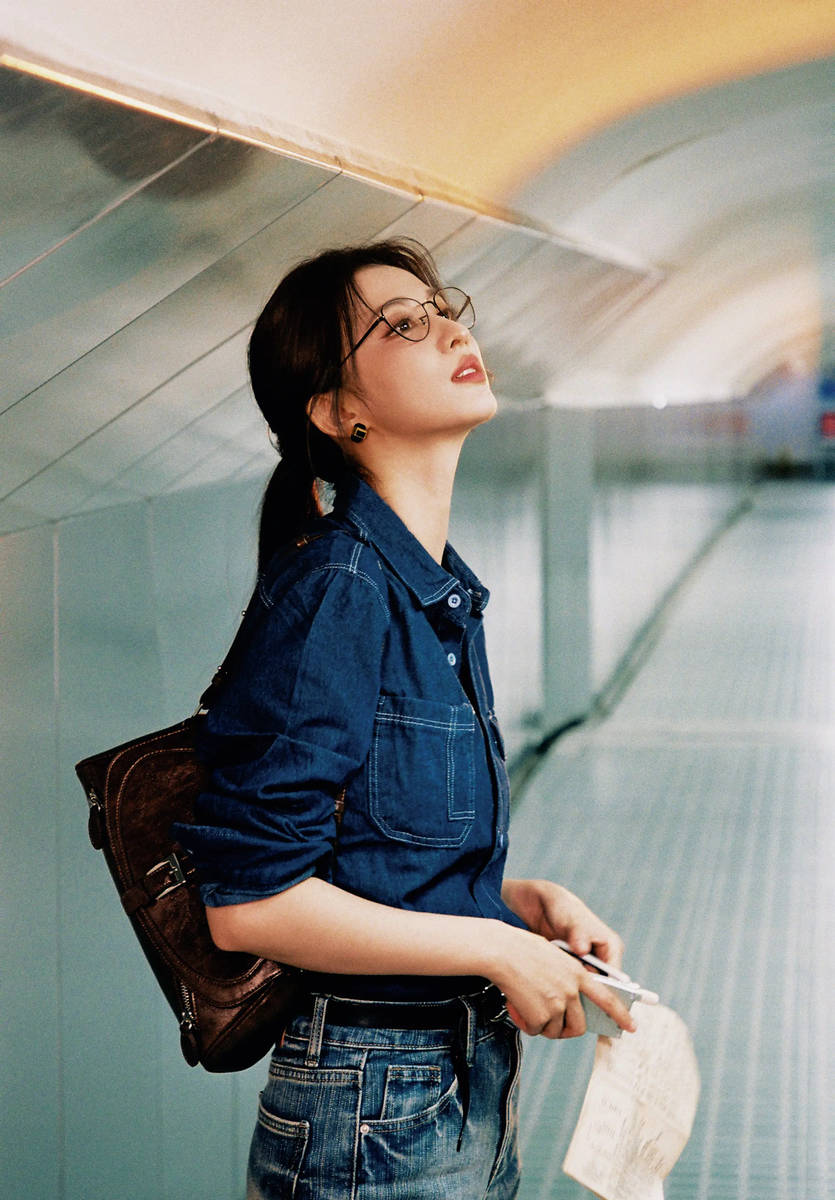 眼镜这一单品本是知性风格的标配,却在王楚然脸上焕发出新的生命力。细窄的金属边框没有遮挡她眉眼间的灵韵,反而与她清澈的眼眸形成呼应,瞳仁在镜片折射下更显沉静。她未施浓妆,仅以通透底妆衬出细腻肌肤,唇间一抹浅杏色唇膏弱化了攻击性,却保留了自带的疏离感。这种“低妆感+高质感配饰”的组合,恰好避开了刻意扮知性的生硬,让高智感如同与生俱来。