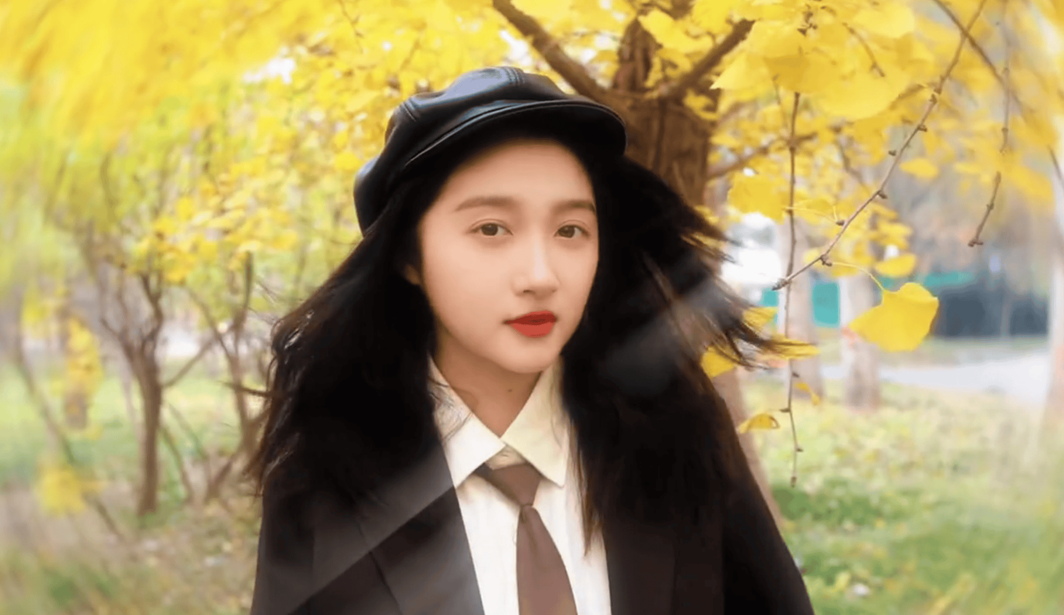 转场的瞬间堪称点睛之笔。随着枫叶轻晃,画面色调悄然变暖,背景已切换成满地金黄的银杏林。此时的关晓彤换上黑色贝雷帽与黑色西装,内搭白衬衫与棕色领带,复古感扑面而来。她侧身倚靠树干,被风吹动的发丝与飘落的银杏叶同频舞动,嘴角噙着浅浅笑意,既有学院风的清新,又不失轻熟的飒爽。一松一紧的造型对比,一绿一黄的场景切换,让短短十几秒的视频充满层次与故事感。