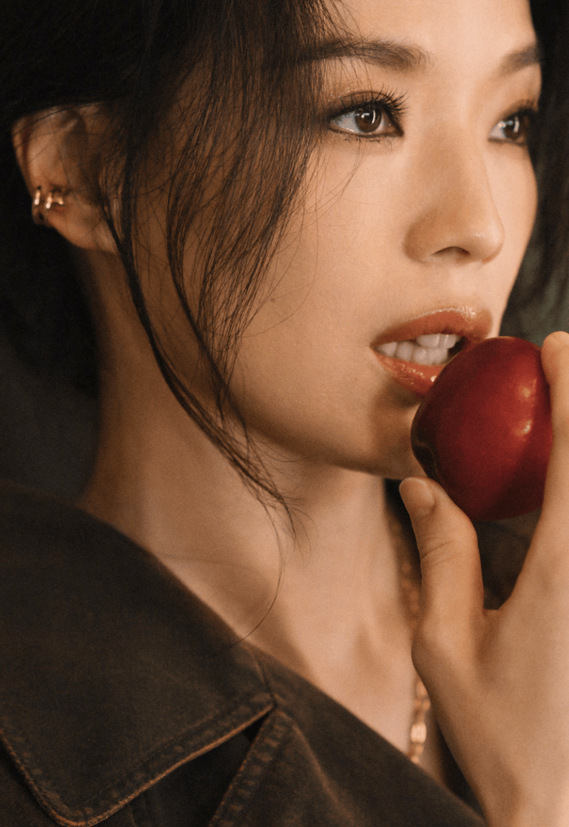 细节的留白更让这份复古韵味落地。她极少堆砌配饰,夸张金属耳环就能点亮白T恤,细腰带轻轻一系便明确腰线,让158cm的身高穿出修长气场。阳光下拍摄时,她拒绝遮阳伞,任凭光线在发丝与衣料上自然游走,这种对“不完美”的包容,让复古造型脱离了刻意复刻的匠气。正如她的私服哲学:“穿衣服不是取悦别人,而是让自己舒服”。