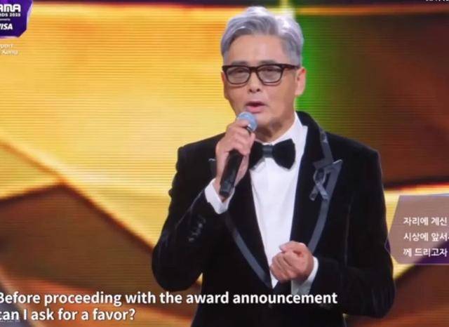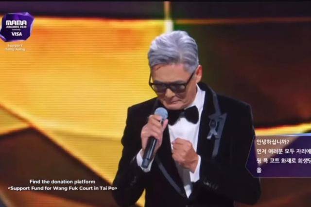 “各位来宾,颁奖前我有个小小的要求,希望大家起身,为我们大埔宏福苑的居民送上衷心的祝福。”粤语初落,喧闹的场馆已现安静的端倪;普通话接续,内地与香港艺人纷纷起身;当英语话音落下,韩国偶像与国际观众尽数站立,三种语言的转换不仅是沟通的需要,更是跨越地域的共情传递。镜头特写中,他攥紧拳头背过身平复情绪,镜片后的泪光与银发相映,让这位“赌神”“小马哥”的银幕形象,多了几分滚烫的人间烟火气。