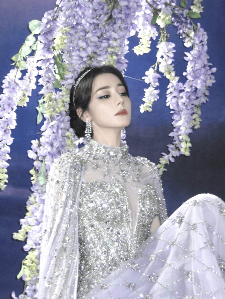 这片花海本就自带诗意基因,紫藤花枝蔓缠绕、花穗垂落的姿态,自古便承载着“深情与依恋”的寓意。而迪丽热巴的到来,让自然之美与人文气韵完成了完美共振。她所穿的银闪长裙并非直白的华丽,而是在光影中流淌着温润光泽,布料摩擦的窸窣声仿佛与花瓣碰撞的轻响融为一体,连空气里都似弥漫着淡淡的花香。这种美不具攻击性,却有着极强的穿透力,让人想起老版《西游记》中女儿国国王出场的经典场景——美得不太真实,却让人挪不开眼。