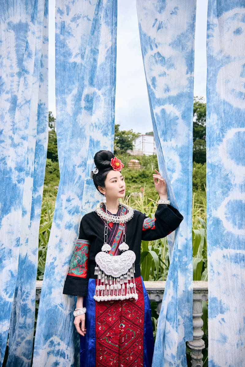 这种用心让她的造型超越了外在美感:当她身着盛装在吊脚楼前刺绣,阳光透过窗棂洒在发丝与绣线上,苗银的光泽与笑容的暖意交融,恰是“穿在身上的史书”与当代传承人的生动对话。正如她所说,这些纹样是“苗族的文化密码”,她要做的就是让这份美丽走出大山。