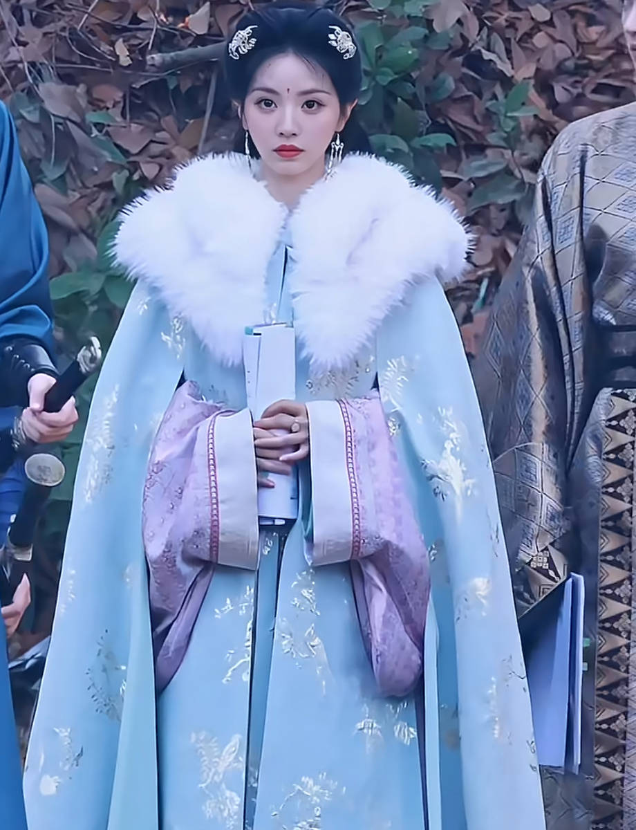白狐毛领的搭配更是将造型的精致度拉满,蓬松柔软的毛领环绕肩颈,既营造出冬日里的温暖氛围感,又与浅蓝衣身形成鲜明的色彩对比,让视觉层次更为丰富。毛领的柔软质感中和了古装的规整感,增添了几分慵懒温婉,而其纯净的白色又自带清冷滤镜,与浅蓝服饰的雅致气质相得益彰,完美诠释了“温婉中藏清冷”的独特韵味。这种冷暖材质的碰撞,让造型既有烟火气的生动,又有疏离感的雅致。