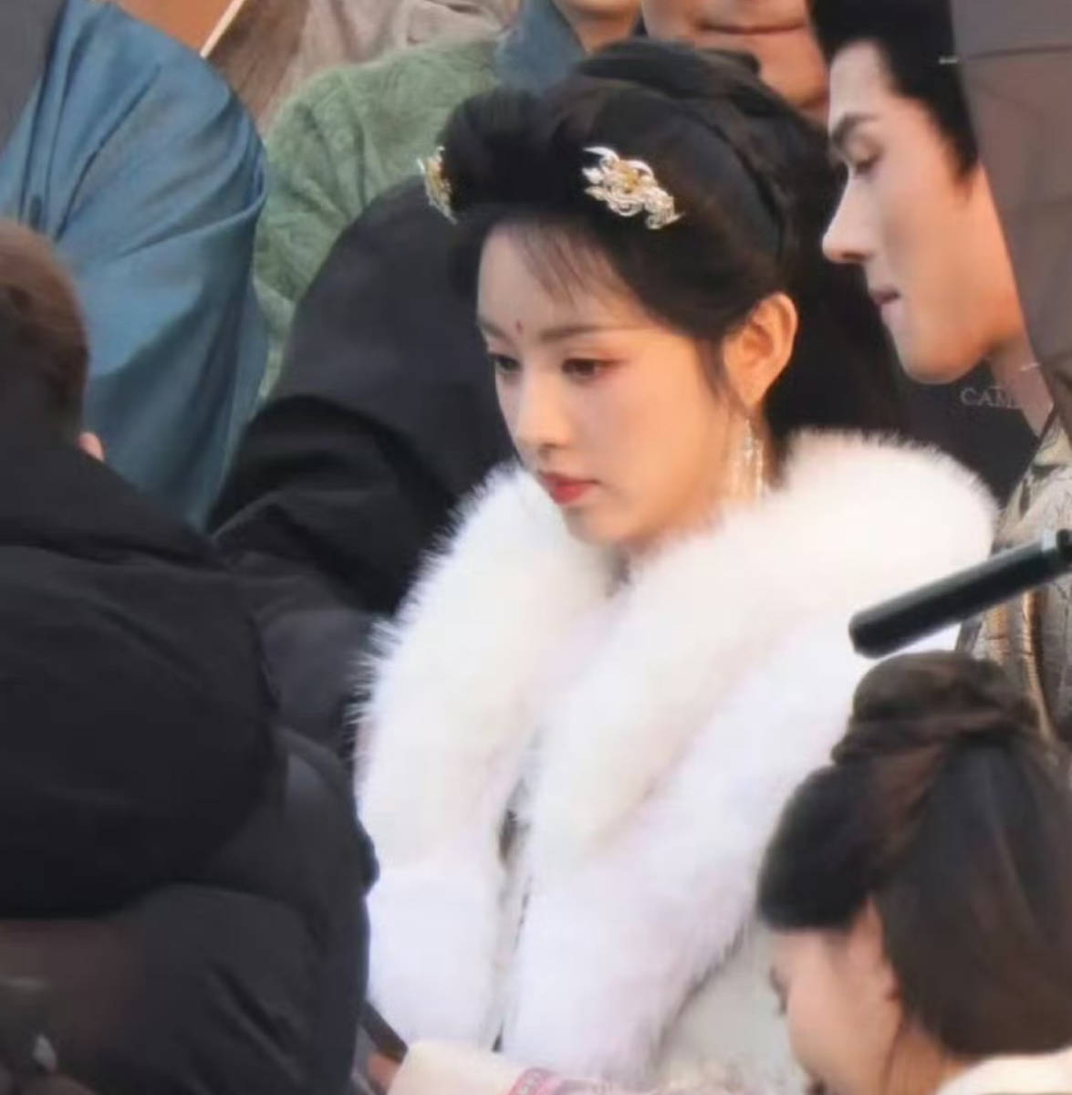 造型的成功不仅在于服饰的精妙搭配,更在于与田曦薇自身气质的高度契合。她的五官精致灵动,空气刘海轻轻垂落,为造型增添了几分娇俏,而眉眼间的澄澈眸光则赋予了造型清冷感,甜与冷的反差让人物形象更具张力。在片场户外实景的映衬下,阳光洒在毛领与衣摆上,为整体造型镀上一层柔光,既保留了片场实拍的鲜活氛围,又让清冷温婉的气质更显突出,仿佛从古典画卷中走出的仕女,兼具灵动与雅致。