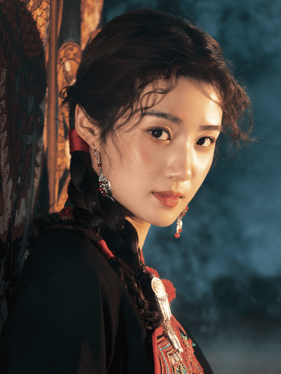 相较于服饰的厚重底蕴,卢昱晓的神态更显灵动松弛,成为造型的点睛之笔。镜头下的她,时而侧坐凝视,眼波流转间带着几分好奇与温婉;时而轻扬嘴角,麻花辫随动作微微晃动,尽显少女的娇俏鲜活;偶有抬眼远望的瞬间,神情舒展淡然,没有刻意的摆拍感,仿佛一位真正生长在畲山畲水间的姑娘,自在享受着这份民族服饰带来的归属感。这种松弛感并非随意,而是源于气质与服饰的深度契合,她不是简单“穿上”衣服,而是让自己融入服饰所承载的文化语境中,让每一个神态都自然天成。