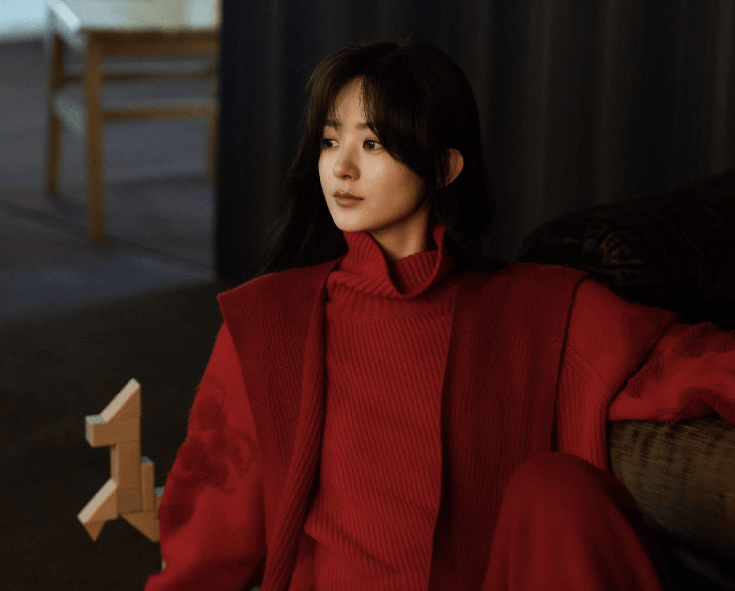 背景的营造则让整体大片的暖意更上一层楼。浅米色的墙面搭配木质家具,暖黄色的灯光在毛衣上投下柔和的阴影,与红色形成温暖的色彩呼应,宛如将冬日暖阳定格在画面之中。其中一张特写镜头里,阳光透过窗棂洒在她的发梢,红色毛衣的光泽与光影交织,既凸显了针织材质的质感,又让整个画面充满电影氛围,恰如她在影视作品中塑造的多元角色那般,兼具柔美与力量。