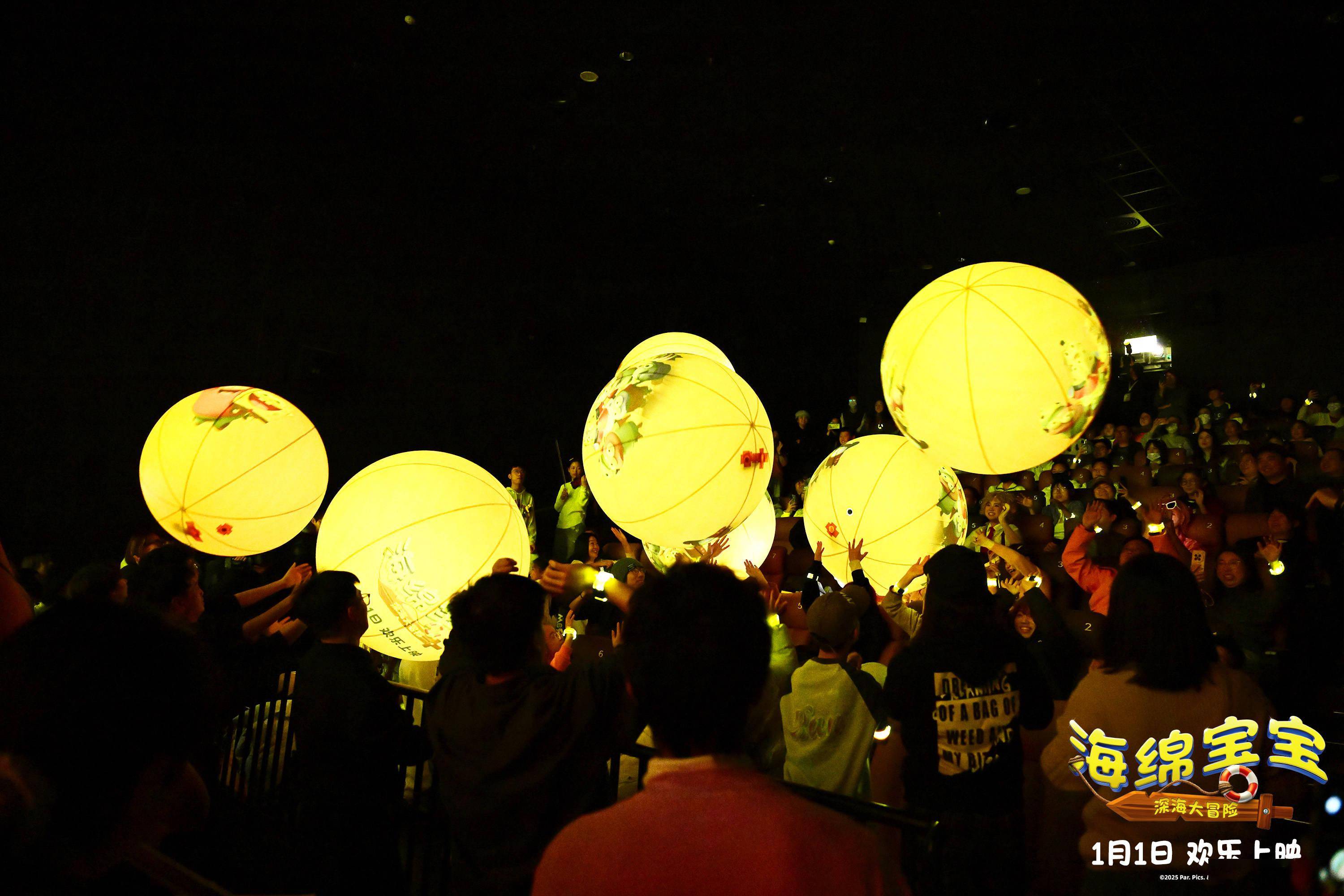 沉浸式互动环节将延续首映礼的欢乐基因,打造全流程仪式感。检票入场时,影院大厅将响起乐队与合唱团现场演绎的海绵宝宝经典主题曲,熟悉的“是谁住在深海的大菠萝里”旋律响起时,瞬间唤醒童年记忆,引发全场跟唱。映后环节更具氛围感,数十个大型发光气球将随片尾音乐同步点亮并抛向观众席,观众在主持人引导下开启荧光手环,整个影厅将化作温暖的黄色光海,在气球传递与手环挥舞中,让旧年的疲惫随欢笑消散。