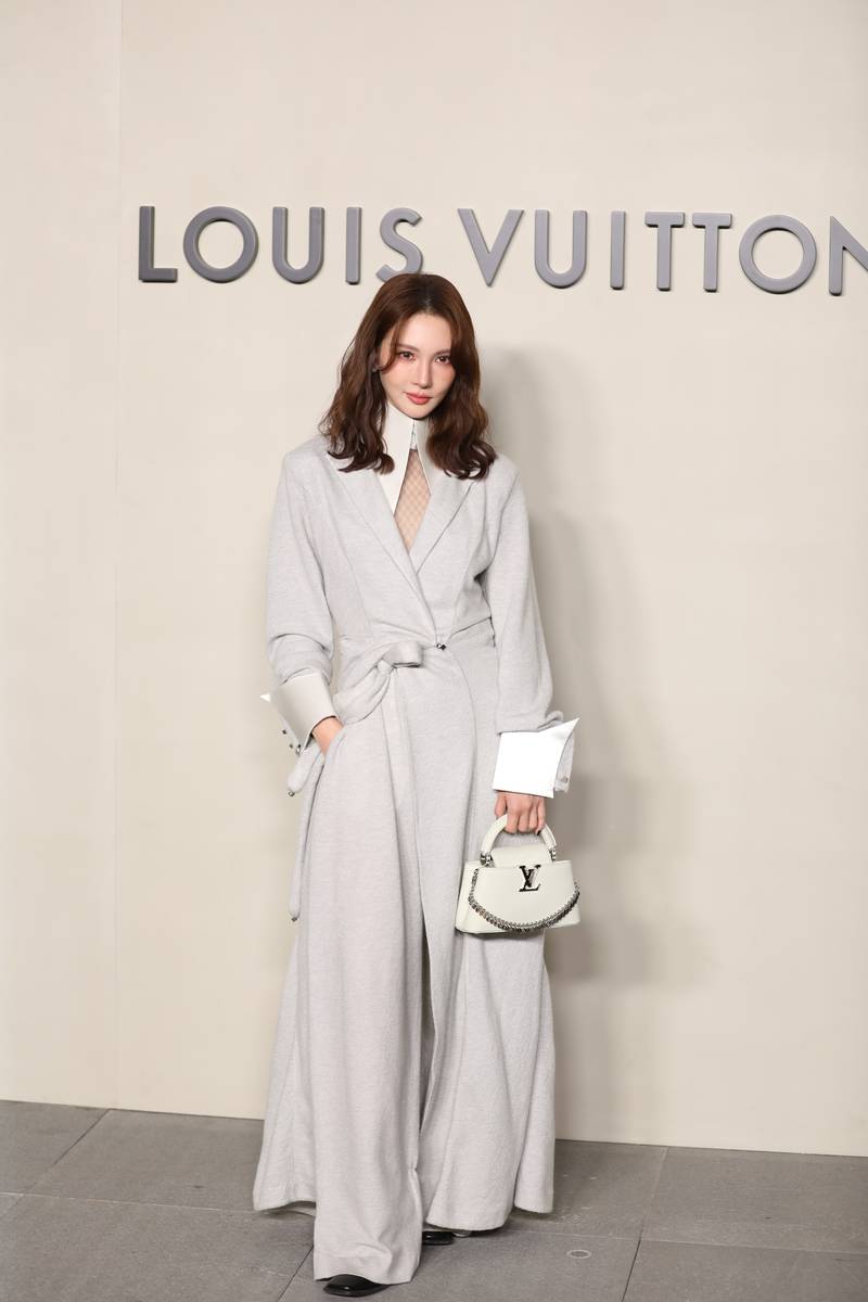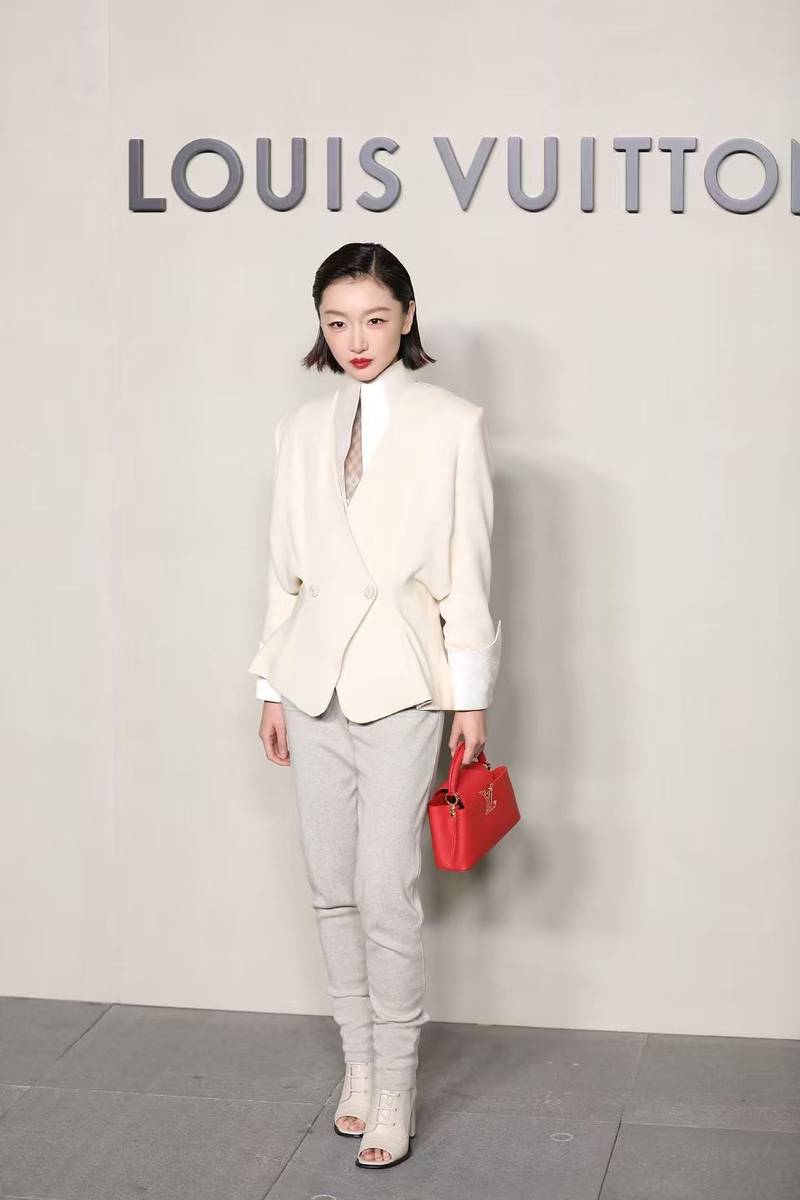 钟楚曦则以独特的松弛感飒翻全场,成为气场派的另一大亮点。她一身白色套装简约大气,搭配慵懒卷发与框架眼镜,看似随意的穿搭却极具记忆点。其五官轮廓分明,中性风造型中透出几分英气,被网友调侃“撞脸萧敬腾”,却也正因这份独特气质在群星中脱颖而出。镜头下的她姿态从容,举手投足间尽是自在随性,将LV的休闲格调诠释得淋漓尽致,完美展现了“高级脸”的超强时尚适配度,每一个定格瞬间都极具大片质感。