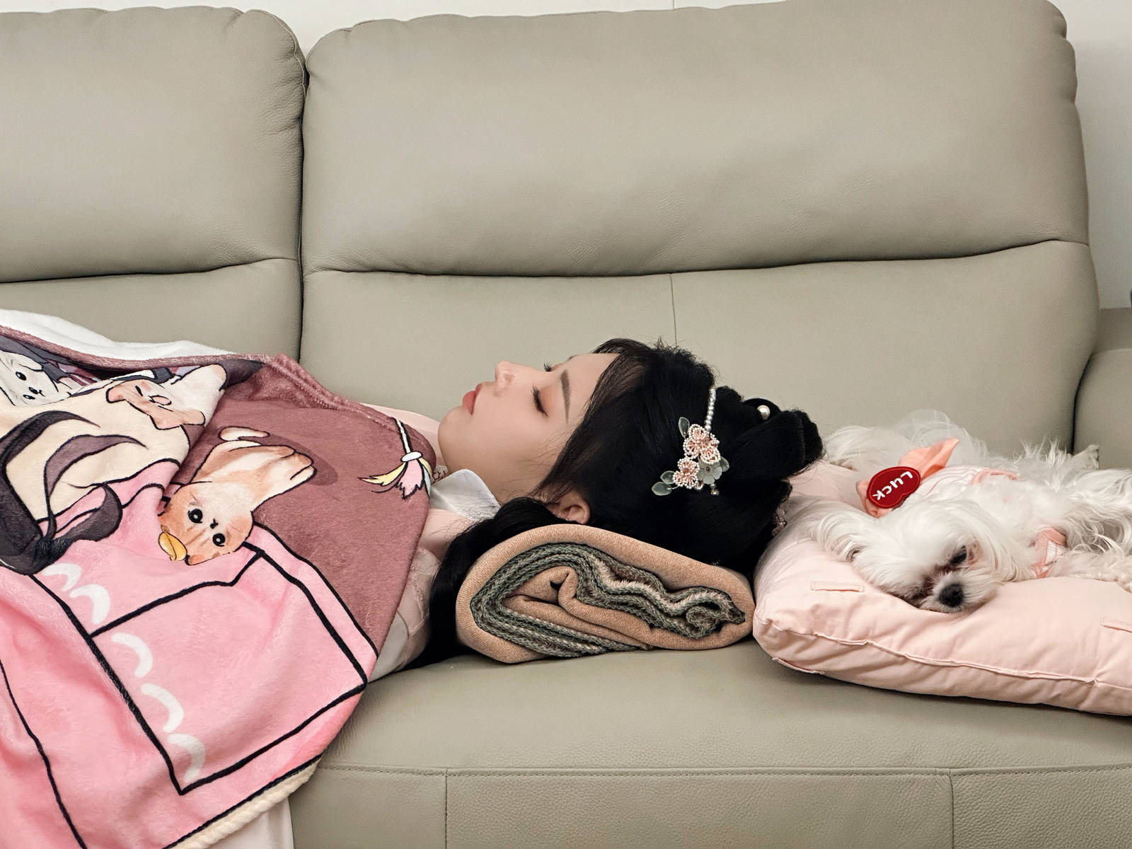 画面里,程潇随意坐在沙发上,姿态慵懒自在,全然没有拍戏时的紧绷感。她将宠物狗温柔拥在怀中,指尖轻触狗狗毛发,眼神柔和宠溺,嘴角不自觉上扬,满是岁月静好的惬意。萌犬乖乖依偎在她怀中,与华丽古装形成巧妙反差,硬核颜值与软萌氛围碰撞出独特火花,让这组随拍更添几分治愈感。据悉,程潇本就是资深铲屎官,家中养有三猫一狗,对小动物的温柔早已刻在细节里。