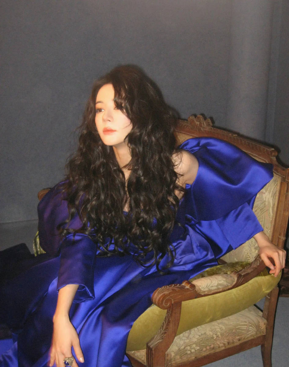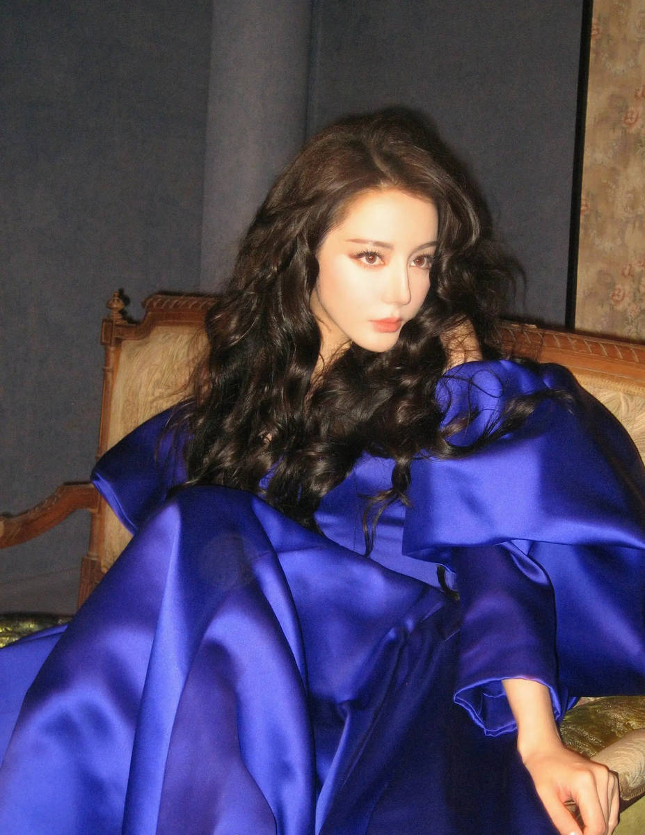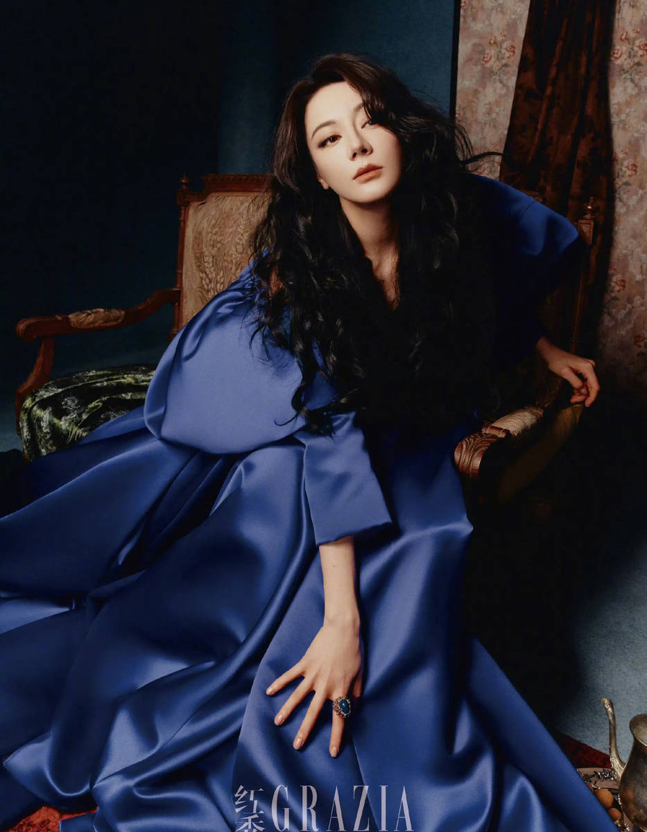 花絮照中,热巴的状态格外松弛自然,打破了常规时尚拍摄的僵硬感。她时而慵懒倚靠在布景旁,裙摆自然铺开,露出纤细的脚踝,尽显优雅姿态;时而与工作人员轻声交流,眉眼弯弯,笑容明媚,瞬间化解了宝蓝色的厚重感,增添了几分亲和力。镜头捕捉到的即兴瞬间更具魅力:抬手整理卷发时的不经意,转头回望时的眼神流转,都将她的五官优势与造型美感展现得淋漓尽致,仿佛从90年代的港风画报中走出来的美人。