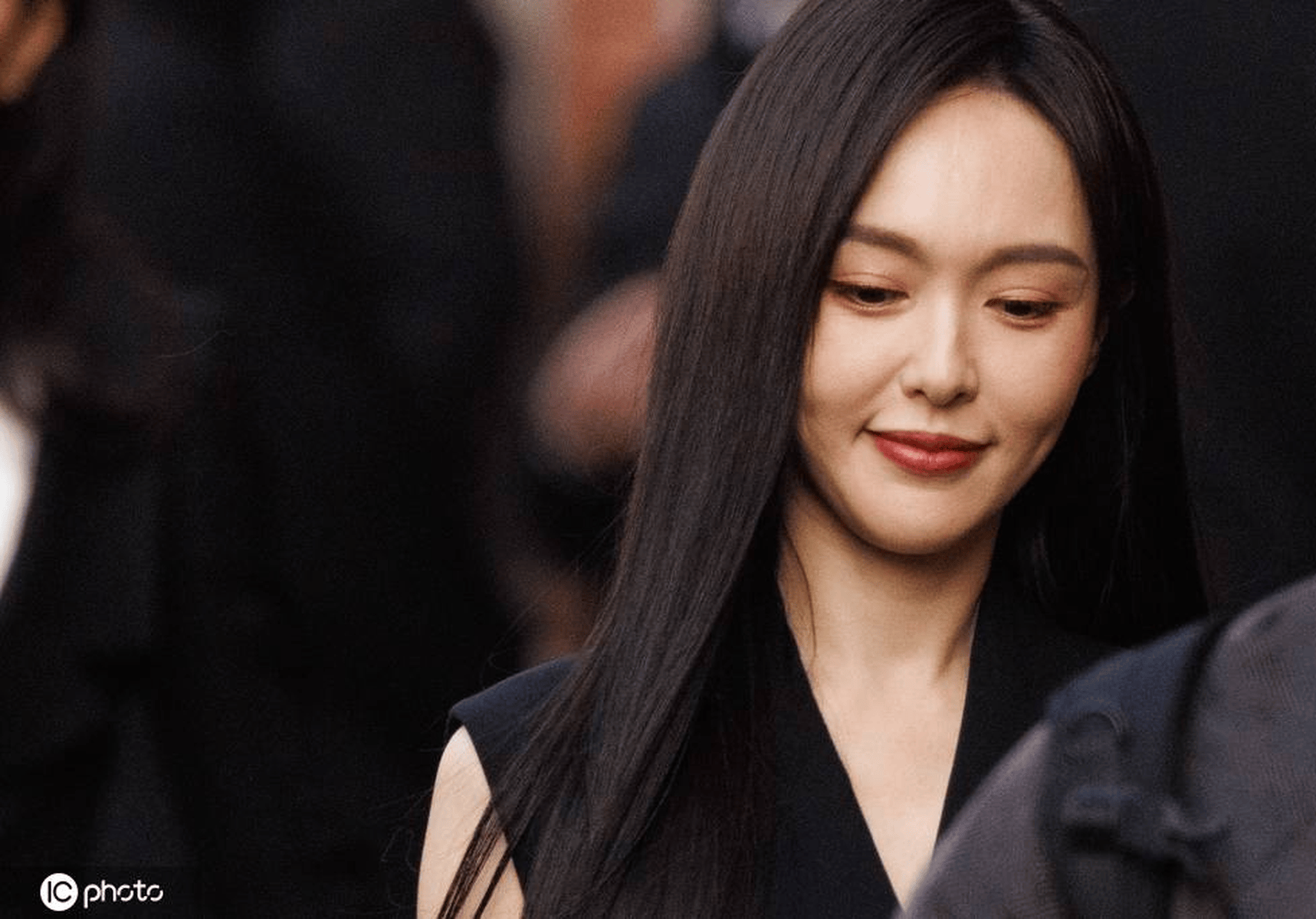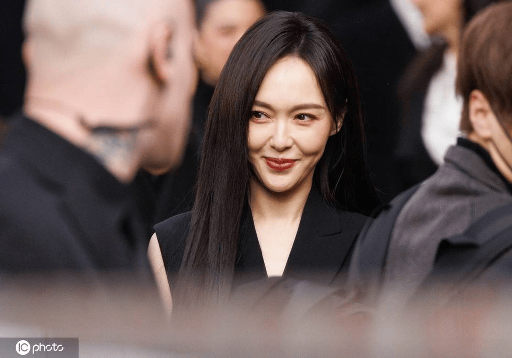 此次看秀,唐嫣的造型堪称静奢风的教科书级演绎。一身黑色无袖西装马甲搭配同色系阔腿裤,垂坠感极佳的面料贴合身形,利落的剪裁将她优越的肩颈线条勾勒得如同艺术品,没有多余的繁复装饰,仅靠极致的面料质感与廓形设计,就把高级感刻进了骨子里。妆容干净清透,哑光红唇点睛,搭配标志性的垂顺黑长直,发丝在米兰的光影下泛着细腻光泽,既平衡了无袖造型的干练,又添了几分清冷柔美。腰间细细的金属链条作为唯一配饰,低调却足够吸睛,完美呼应了Fendi新任创意总监回归首秀“Less I, more us”的核心主题。
