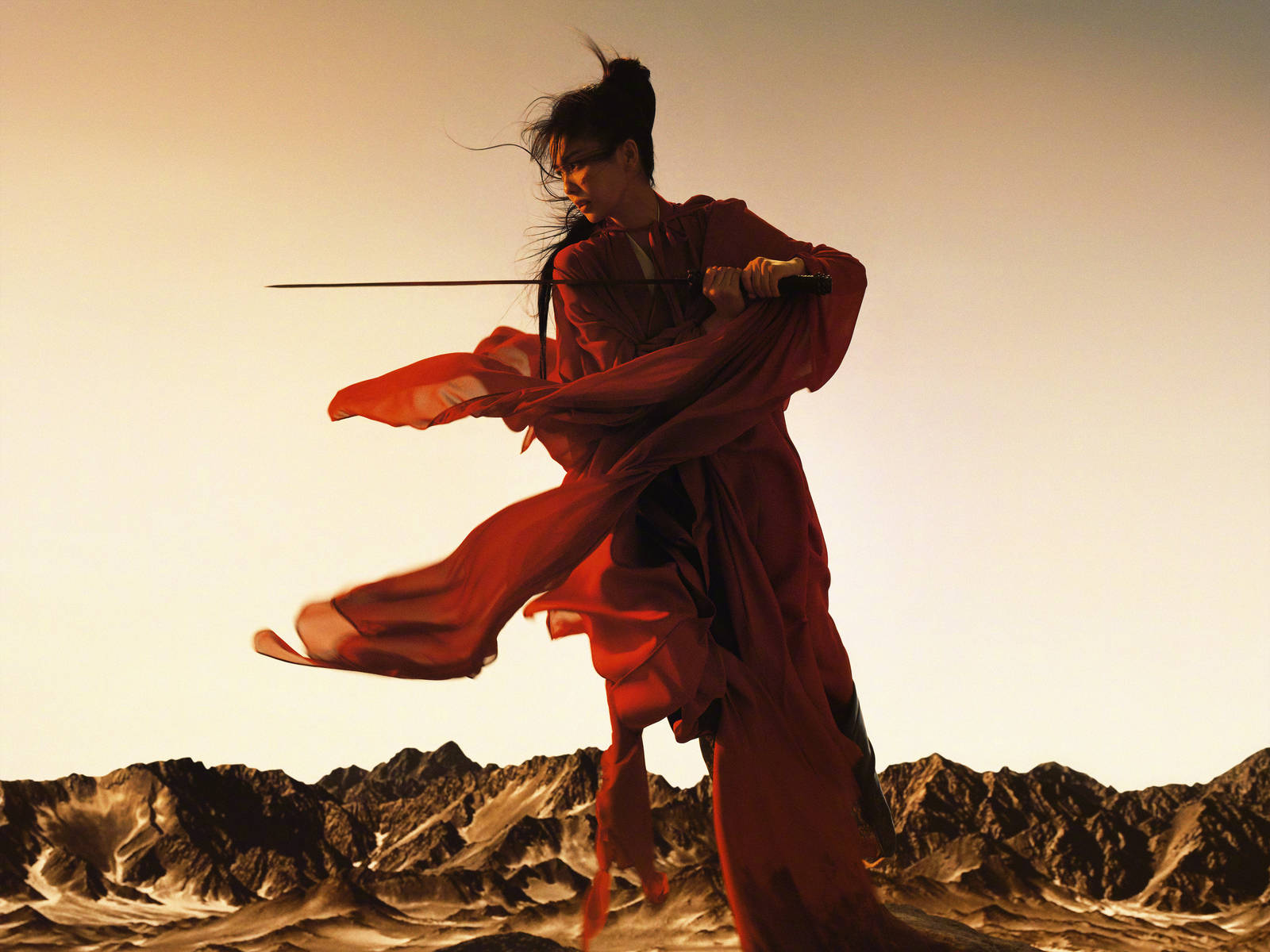 写真中,白鹿身着一袭利落红衣,衣料轻盈飘逸,在风中猎猎作响,如同大漠中燃烧的火焰,热烈又耀眼,打破了传统武侠造型的凌厉感,多了几分柔婉的韵味。红衣剪裁得体,勾勒出挺拔的身姿,束发造型干净利落,额间简约修饰更添几分侠气,眉眼间褪去青涩,多了几分坚定与洒脱,既有女子的温婉优雅,又有侠客的豪迈飒爽,反差感拉满。