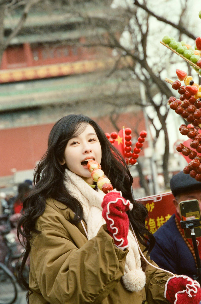背景定格在北京鼓楼,灰墙黛瓦间藏着老北京的韵味,风吹起她的发丝,氛围感拉满。最吸睛的莫过于她手中那串糖葫芦,红彤彤的山楂裹着晶莹剔透的糖衣,在阳光下泛着琥珀色的光泽,仿佛隔着屏幕都能闻到淡淡的焦糖香。陈都灵手持糖葫芦,时而轻轻咬下一口,腮帮子微微鼓起,嘴唇上沾着细碎的糖渣,眼睛眯成月牙,一脸满足的模样,娇憨又可爱;时而举着糖葫芦对着镜头浅笑,灵动的眼神里满是欢喜,与身后古色古香的鼓楼相映成趣,既有江南女子的温婉,又有少女的灵动俏皮。
