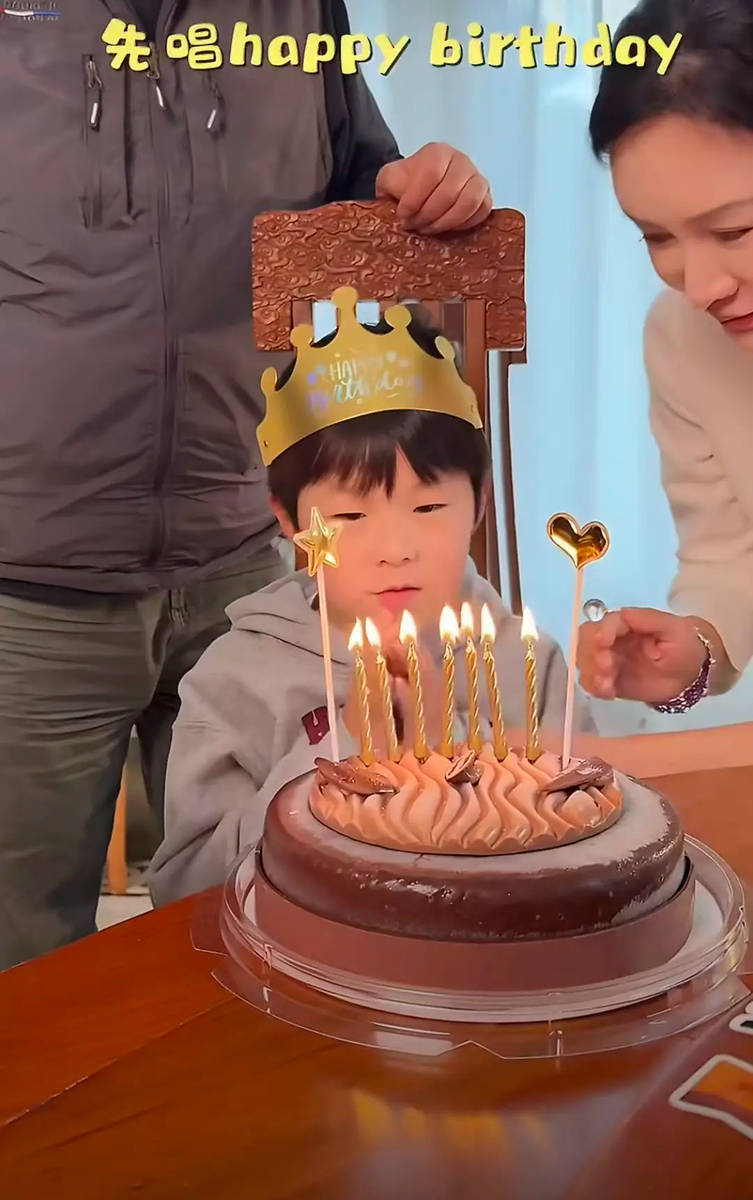 庆生现场被布置得十分用心,家中随处可见彩色气球与温馨装饰,餐桌旁更是摆好了孩子们最爱的巧克力蛋糕,蜡烛早已整齐插好,就等小寿星登场。当天,二儿子嘟嘟头戴生日皇冠,呆萌可爱的模样格外惹人疼爱,作为全场的主角,他坐在C位,眼神里满是期待与欢喜。